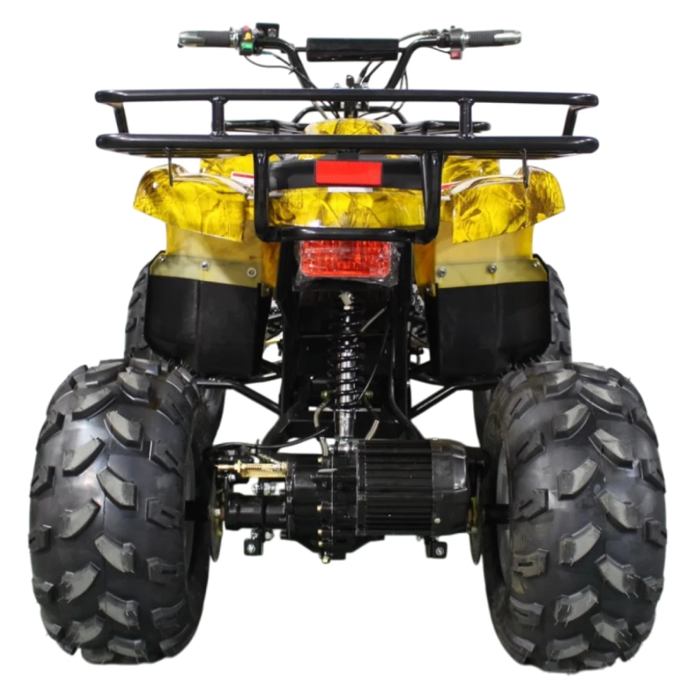 Данный квадрик обладает пониженной передачей, барабанными передними тормозами, а сзади - ножным дисковым гидравлическим тормозом. У него тихий и мягкий ход из-за отсутствия цепной передачи и наличия дифференциала.