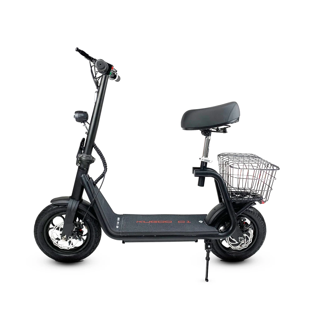 Электросамокат Kugoo C1 это агрегат для повседневного использования, от популярного производителя компании Jilong. Транспорт имеет прочную, удобную конструкцию, широкая дека позволяет комфортно расположить ноги, сидение можно отрегулировать по высоте. Самокат оборудован корзиной, на нем можно спокойно отправиться за покупками, и не думать, как их держать на обратном пути.