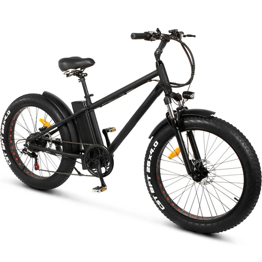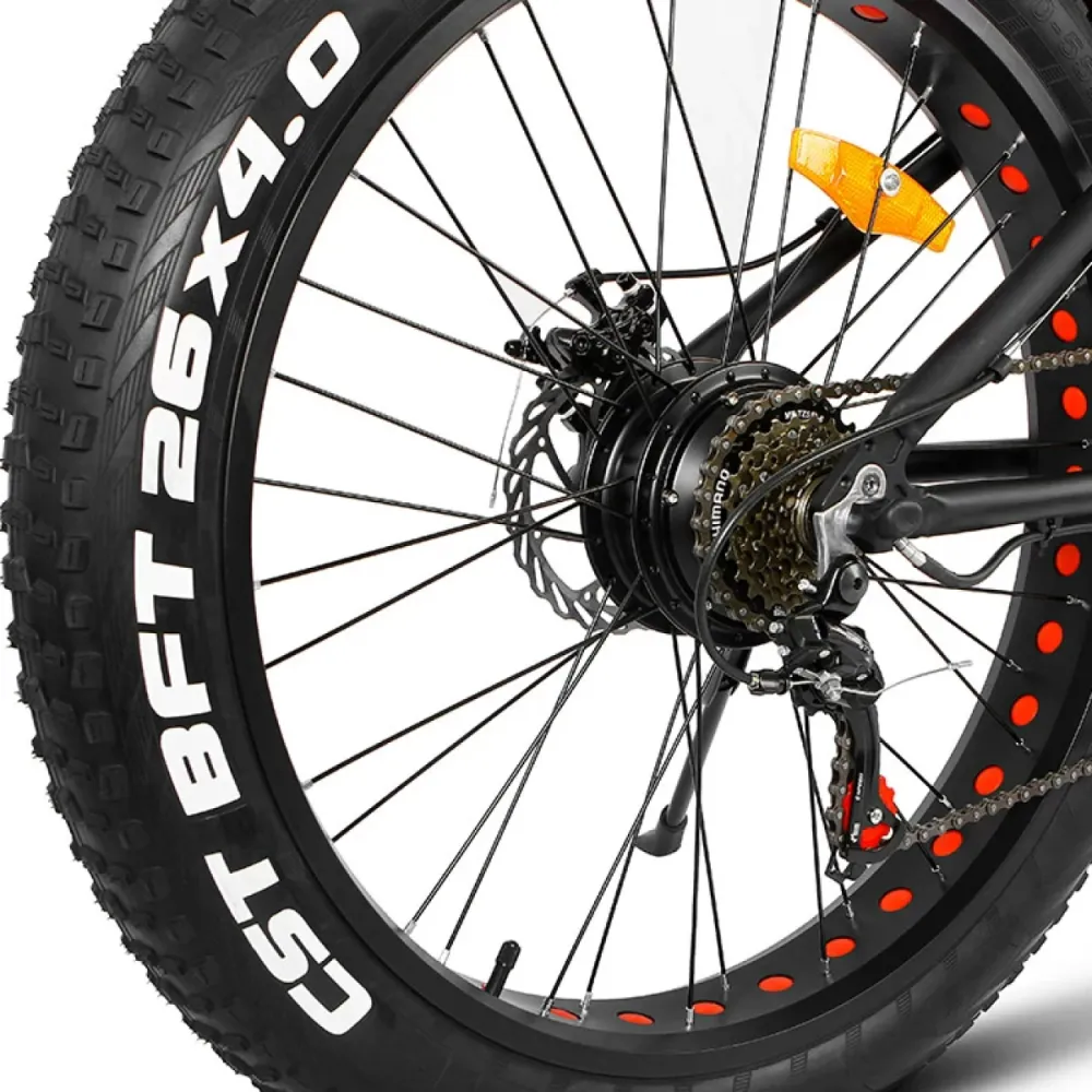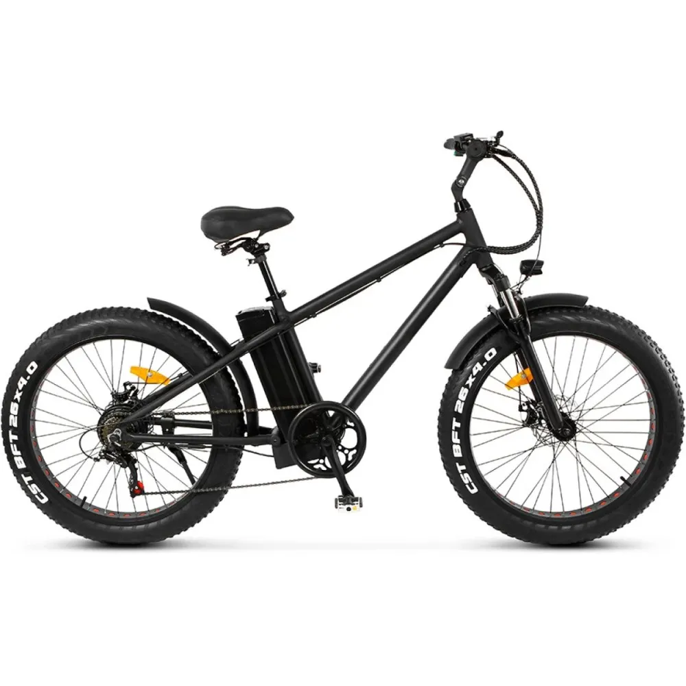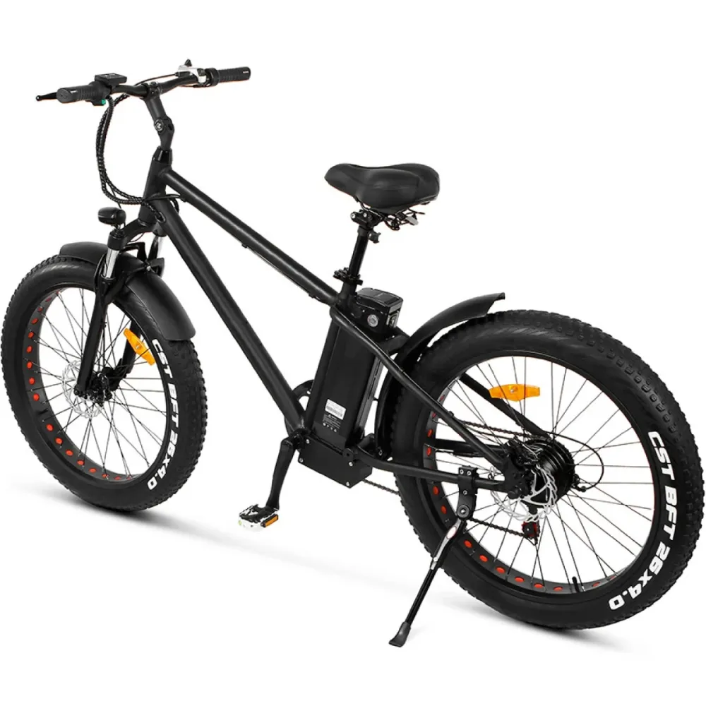Электро фэтбайк Unimoto PUMA в черном цвете – техника рассчитана на маневрирование, экстремальное вождение, езду по бездорожью и другой проблематичной местности. Мощные 26-дюймовые колеса с широкими покрышками надежно сцепляются с покрытием, обещают устойчивую накатистую езду независимо от условий погоды и ровности грунта. При весе 29 кг техника рассчитана на грузоподъемность до 110  кг. Купить модель по привлекательной стоимости,  без переплат предлагает наш интернет-магазин.