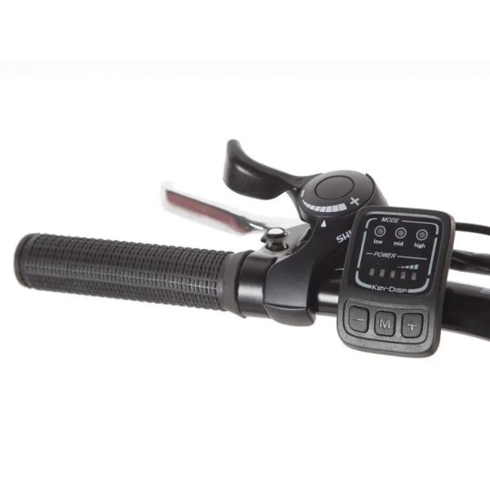 Электровелосипед Eltreco Impulse EM 502 имеет информационное табло, где можно посмотреть уровень заряда батареи. Колеса диаметром 26 дюймов, с протекторными покрышками.